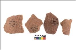 | Description / विवरण | Specimen of flake tool with prominent flaking marks. They are made up of a short flakes with sides trimmed and most of them are rectangular in shape. |