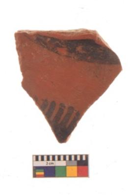 | Description / विवरण | Specimen of black on red ware with black decorative Semi circle with small vertical lines geometric painting. |