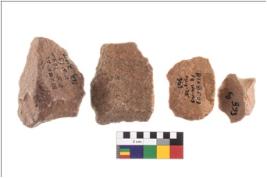 | Description / विवरण | Specimen of flake tool with prominent flaking marks. They are made up of a short flakes with sides trimmed and most of them are rectangular in shape. |