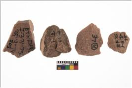 | Description / विवरण | Specimen of flake tool with prominent flaking marks. They are made up of a short flakes with sides trimmed and most of them are rectangular in shape. |