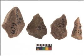 | Description / विवरण | Specimen of flake tool with prominent flaking marks. They are made up of a short flakes with sides trimmed and most of them are rectangular in shape. |