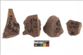 | Description / विवरण | Specimen of flake tool with prominent flaking marks. They are made up of a short flakes with sides trimmed and most of them are rectangular in shape. |