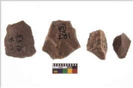 | Description / विवरण | Specimen of flake tool with prominent flaking marks. They are made up of a short flakes with sides trimmed and most of them are rectangular in shape. |