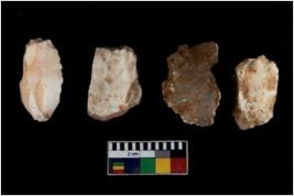 | Description / विवरण | There are n 4 utilized flake cores. Out of them two are made up of Chert and two are made up of Chalcedony.There are multi directional irregular scar pattern on them. One has sharp edge and three are tapering at one end. |
