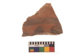 | Description / विवरण | Specimen of black on red ware with black decorative Triangles between lines geometric painting. |