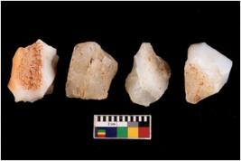 | Description / विवरण | Four utilised worked cores with sharp edges. Some of them are tapering at one end. Removal of flakes from few sides. |