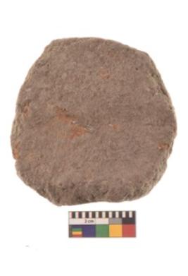 | Description / विवरण | Specimen of ground disc hopscotch made from a red ware. It has jagged edges with sign of chipping. It is rounded in shape. |