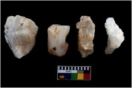 | Description / विवरण | Four utilised worked cores with sharp edges. Some of them are tapering at one end. Removal of flakes from few sides. |
