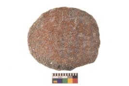| Description / विवरण | Specimen of ground disc hopscotch made from a red ware. It has jagged edges with sign of chipping. It is rounded in shape.some painted line is visble |