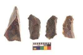 | Description / विवरण | There are n 4 cores; There are multidirectional irregular scar pattern on them. Some of them are tapering at one end. One of them flat thick bottom and pointed functional top. |