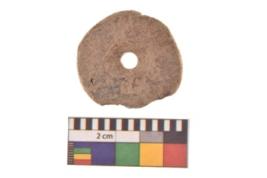 | Description / विवरण | A partially broken specimen of terracotta wheel with broken edges and scratch marks on one side near perforation. |