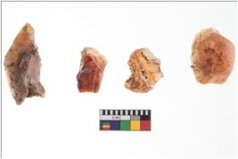 | Description / विवरण | There are n 4 utilized flake cores. There are multidirectional irregular scar pattern on both dorsal and ventral face of the flake cores. One has sharp edges and three have blunted edges. |