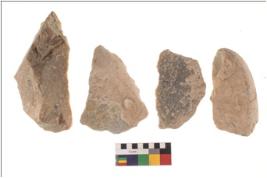 | Description / विवरण | There are n 4 flakes;there are triangular flake with wavy thick distal end and pointed functional top.It reained pebbly cortex on one side and irregular thin edge on the other. |