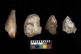 | Description / विवरण | There are n 4 utilized flake cores. There are multi directional irregular scar pattern on them. One is tapering at one end and three have blunted edges. |