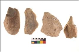 | Description / विवरण | Specimen of a Irregular flaked pebble with projected pointed top and flat bottom. |