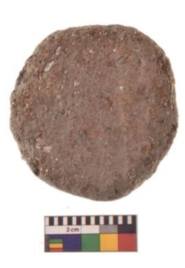 | Description / विवरण | Specimen of ground disc hopscotch made from a red ware. It has jagged edges with sign of chipping. It is rounded in shape. |