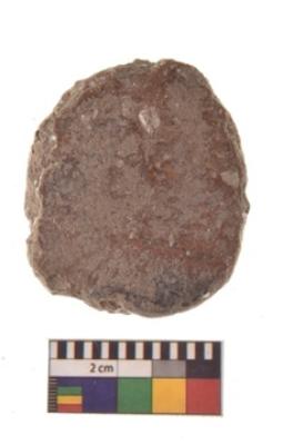 | Description / विवरण | Specimen of ground disc hopscotch made from a red ware. It has jagged edges with sign of chipping. It is rounded in shape. |