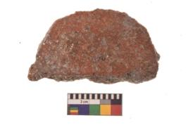 | Description / विवरण | Specimen of ground disc hopscotch made from a red ware. It has jagged edges with sign of chipping. It is rounded in shape. |
