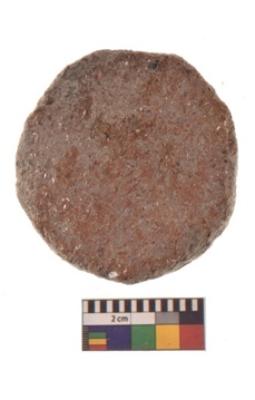 | Description / विवरण | Specimen of ground disc hopscotch made from a red ware. It has jagged edges with sign of chipping. It is rounded in shape. |