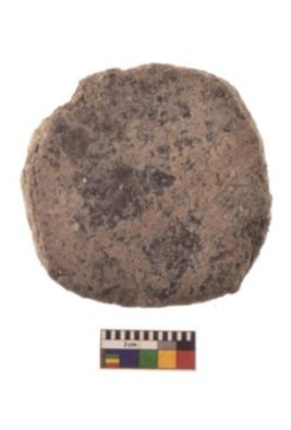 | Description / विवरण | Specimen of ground disc hopscotch made from a red ware. It has jagged edges with sign of chipping. It is rounded in shape. |
