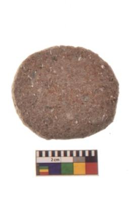 | Description / विवरण | Specimen of ground disc hopscotch made from a red ware. It has jagged edges with sign of chipping. It is rounded in shape. |