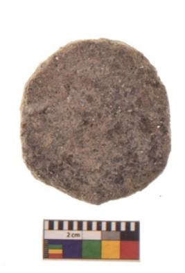 | Description / विवरण | Specimen of ground disc hopscotch made from a red ware. It has jagged edges with sign of chipping. It is rounded in shape. |
