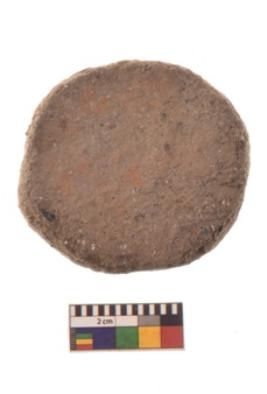 | Description / विवरण | Specimen of ground disc hopscotch made from a red ware. It has jagged edges with sign of chipping. It is rounded in shape. |