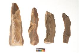 | Description / विवरण | There are n 4 flakes tool; there are large flakes with sides trimmed, Marks of secondary flaking are present on the both the faces.The dorsal is relatively flat. |