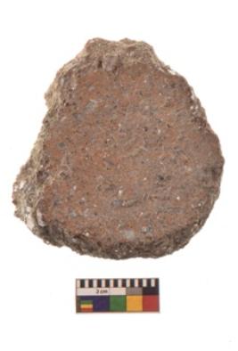 | Description / विवरण | Specimen of ground disc hopscotch made from a red ware. It has jagged edges with sign of chipping. It is rounded in shape. |