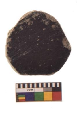 | Description / विवरण | Specimen of ground disc hopscotch made from a black ware. It has jagged edges with sign of chipping. It is rounded in shape. |