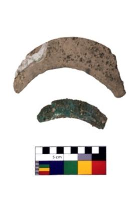| Description / विवरण | 1 A complete specimen of a large crescent made of a thin sheet of copper; its inner edge is slightly sharp and suggests that it might have been used as a hollow scraper, but it is too thin to have been used as a tool. It is not unlikely that it was used as an ornament. 2 A crescent of copper, similar No. 1st but smaller in size. |