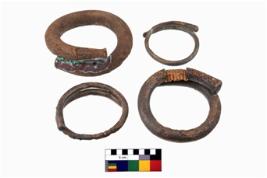 | Description / विवरण | 1 A complete specimen of a thick anklet or bangle with truncated ends and without any decoration. 2 A plain bangle, thin in section and small in size than the precending. It has thickened ends. 3 An anklet, round in section, having thickened terminals which are decorated with incised herring bone pattern. On one end is incised a cross with oblique strokes on either side of each arm whereas on the other side there is a cross with a semo-circle between two arms. |