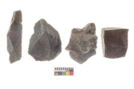 | Description / विवरण | There are n 4 utilized flake cores. There are multi directional irregular scar pattern on both dorsal and ventral face of the flake cores. One is tapering at one end and three have blunted edges. |