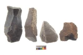 | Description / विवरण | There are n 4 utilized flake cores. There are multi directional irregular scar pattern on both dorsal and ventral face of the flake cores. Two are tapering at one end and two have blunted edges. |