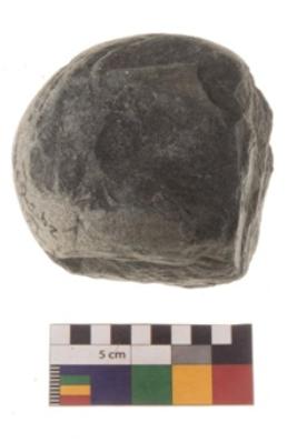 | Description / विवरण | Specimen of a Hammer stone roughly rounded in shape with grounded edges and flattish base. |