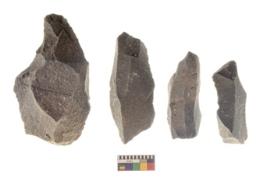 | Description / विवरण | There are n 4 utilized flake cores. There are multi directional irregular scar pattern on both dorsal and ventral face of the flake cores. Two are tapering at one end and two have sharp edges. |