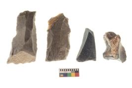 | Description / विवरण | There are n 4 utilized flake cores. There are multi directional irregular scar pattern on both dorsal and ventral face of the flake cores. Two are tapering at one end and two have sharp edges. |