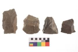 | Description / विवरण | There are n 4 utilized flake cores. There are multi directional irregular scar pattern on both dorsal and ventral face of the flake cores. Three have flat base and one has blunted edge. |