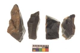 | Description / विवरण | There are n 4 utilized flake cores. There are multi directional irregular scar pattern on both dorsal and ventral face of the flake cores. Two are tapering at one end and two have sharp edges. |