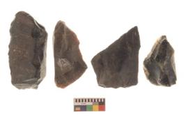 | Description / विवरण | There are n 4 utilized flake cores. There are multi directional irregular scar pattern on both dorsal and ventral face of the flake cores. Two are tapering at one end and two have sharp edges. |