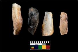 | Description / विवरण | There are n 4 utilized flake cores. There are multi directional irregular scar pattern on them. Three are tapering at one end and one has sharp edge. |
