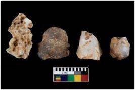 | Description / विवरण | There are n 4 utilized flake cores. There are multi directional irregular scar pattern on them. One is tapering at one end and three have blunted edges. |