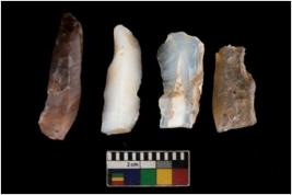 | Description / विवरण | There are n 4 utilized flake cores. There are multi directional irregular scar pattern on them. Three are tapering at one end and one has sharp edge. |