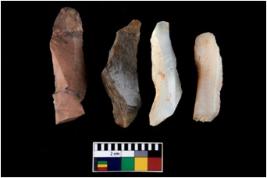 | Description / विवरण | There are n 4 utilized flake cores. Out of them one is made up of Chert and three are made up of Chalcedony. There are multi directional irregular scar pattern on them. Three are tapering at one end and one has sharp edge. |