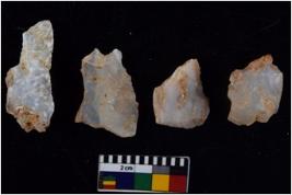 | Description / विवरण | There are n-4 of utilized Flakes . There are multidirectional irregular dominant scar pattern on both dorsal and ventral face of the cores. Some of them bulge of percussion and some are flat flake cores. |