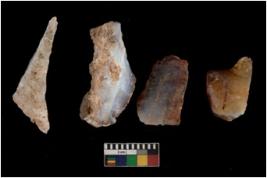 | Description / विवरण | There are n 4 utilized flake cores. There are multi directional irregular scar pattern on them. Two are tapering at one end and two have blunted edges. |