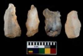 | Description / विवरण | There are n 4 utilized flake cores. There are multi directional irregular scar pattern on them. Two are tapering at one end and two have sharp edges. |