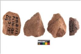 | Description / विवरण | Specimen of flake tools with prominent flaking marks. They are made up of a short flakes with sides trimmed. |