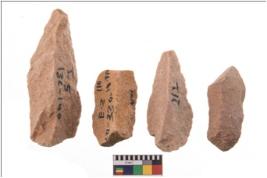 | Description / विवरण | Specimen of flake tools with prominent flaking marks. They are made up of a short flakes with sides trimmed. |
