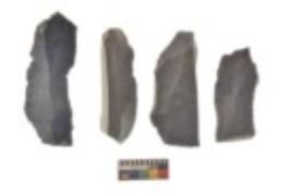 | Description / विवरण | There are n 4 utilized flake cores. There are multi directional irregular scar pattern on both dorsal and ventral face of the flake cores. Three are tapering at one end and one has sharp edge. |